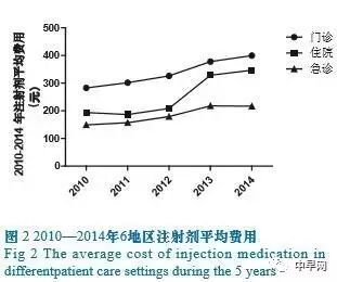 根据中国药学会《医院处方分析合作项目》的数据分析,北京、上海、广州等6所城市共85家医院(其中二级医院25家和三级医院60家,具体见表1)的近5年处方和医嘱进行横断面分析(每季度抽取10 天,全年共抽取40天的处方和医嘱)。 研究表明从2010—2014年,我国6地区门诊和急诊的注射剂的使用比例出现一定程度的下降趋势,然而住院患者的注射剂使用比例(横断面)则出现较大幅度的升高,从69.6%增长至74.2%(见图1)。我国6地区门诊、住院和急诊的注射剂平均费用出现增长,尤其以住院患者的注射剂费用增长较为迅速,从193.8元增长至346.7元(见图2)。