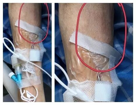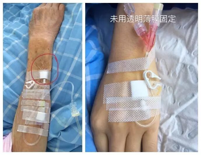 从下图左可以看出,该患者采用了逆行穿刺的方法进行外周静脉留置针置管,而其中用了多道胶布固定留置针延长管。下图右未用透明薄膜敷料固定,直接在穿刺点上方使用无纺布敷贴固定。这两个案例都会影响穿刺点的评估。