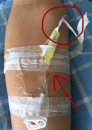 从图片中可以开出,输液结束留置针未做到U型固定,而更为严重的是一侧端帽已脱落,留置针处于开放状态。