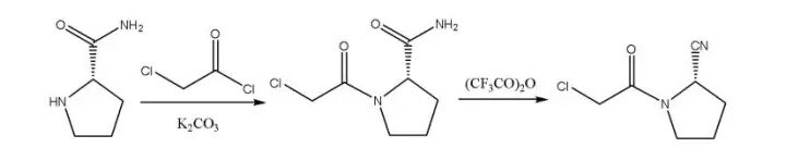 对于权利要求1保护的化合物的制备和结构确认而言, 说明书实施例1记载了权利要求1所述化合物的制备方法,包括A、B、C三个步骤,其中步骤A为1一金刚烷基胺 HC1被浓硫酸和浓硝酸混合物氧化形成1- 氨基金刚烷一3一醇,步骤B为氯代乙酰氯与 L一脯氨酰胺在碳酸钾存在下缩合, 然后在三氟乙酸酐存在下脱水, 得到1一氯代乙酰基一2一氰基吡咯烷,步骤 C为使步骤A的化合物与步骤 B的化合物反应得到化合物1-[(3一羟基一1一金刚烷基)氨基]乙酰基一2一氰基吡咯烷(S) (参见本专利说明书实施例1步骤 A-C)。上述反应路线用反应式表示如下: