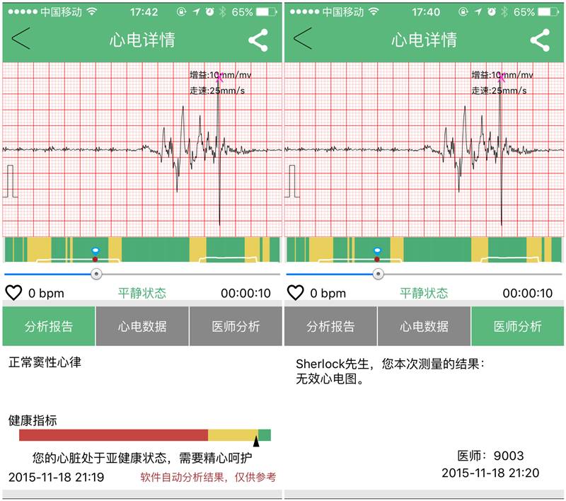 测试结果中会有最高心率、最低心率和平均心率3项检测数据,还会判断心律是否正常。除了心电数据和人自动生成的分析报告,还有人工医师分析,分析结果会在测试结束不久后生成。相比自动分析报告,人工医师分析更为准确。例如笔者检测时由于没有固定好,将其摘下重新固定,导致测试数据出现问题。此时自动生成的报告显示正常窦性心律,而医师分析称这是“无效心电图”。