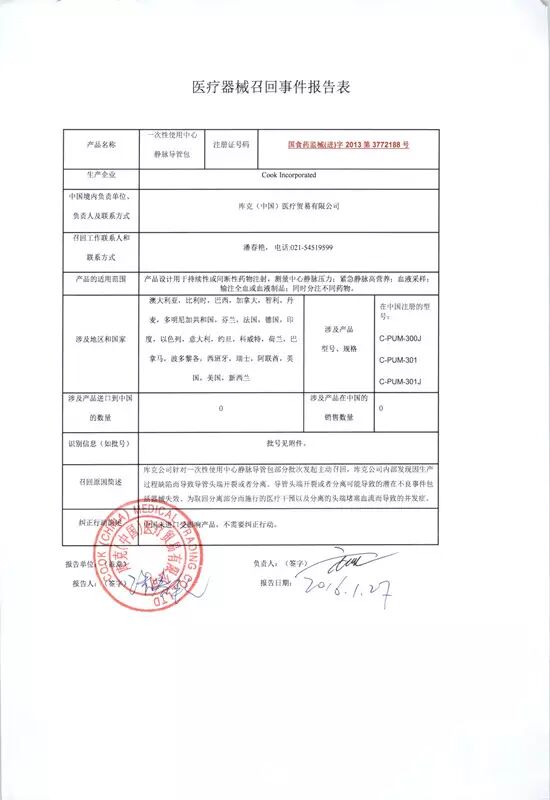 一一库克(中国)医疗贸易有限公司报告,该公司代理的一次性使用中心静脉导管包(注册证编号:国食药监械(进)字2013第3772188号),由于以上产品的导管头端存在开裂或者分离的问题,其生产商Cook Incorporated对该产品进行主动召回。该公司称本次召回产品未在中国销售。请各省、自治区、直辖市食品药品监督管理局加强对此类产品的监督管理。