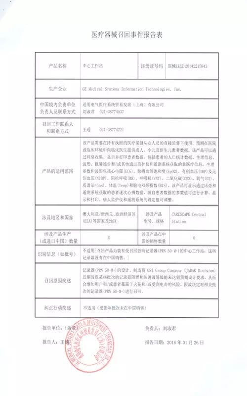 一一通用电气医疗系统贸易发展(上海)有限公司报告,该公司代理的中心工作站(注册证编号:国械注进20142215843),由于以上产品的记录器阻燃和放进液等级未能达到预期设计要求,其生产商GE Medical Systems Information Technologies, Inc.对该产品进行主动召回。该公司称本次召回产品未在中国销售。请各省、自治区、直辖市食品药品监督管理局加强对此类产品的监督管理。