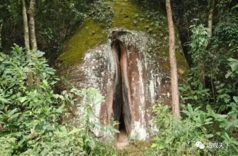 锦江东岸,密林深处,只有羊肠小道拾级进入,见幽暗绿荫下隐匿另一座半圆形岩石,高10.3米,宽4.8米,中间一道长4.3米,最宽处0.8米,深4米的洞口。岩石呈粉红色,酷似,这就是人称“生命之源”的阴元石。
