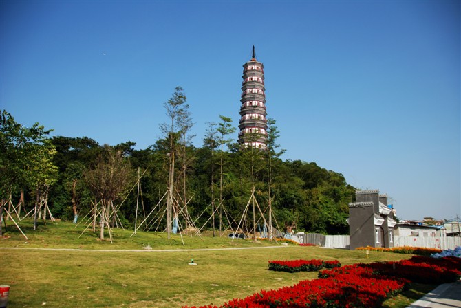 琶洲塔位于广东省广州市海珠区的琶洲(今新港东路),靠近珠江边,琶洲塔为八角形楼阁式,青砖砌筑,外观9级,内分17层,高50余米。坐落在广州市海珠区琶洲。首层直径12.7米,边长4.95米,壁厚3.97米,辟3门,南北门进首层塔心室,西门原有砖砌梯级上二层(暗层)塔心室。