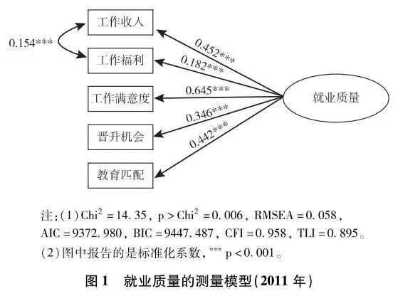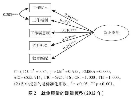 本研究的因变量主要是(月)工作收入和就业质量。工作收入包括工资、奖金、住房补贴、交通补贴、伙食补贴、实物收入等等。工作收入是衡量就业质量的核心指标,但还不是全部。就业质量研究起源于美国的“工作生活质量”研究,近年来也开始受到国内学者的关注,但在概念内涵上尚缺乏共识(参见张凯,2015)。对大学生的就业质量研究也存在类似问题(参见王广慧等,2015),但从经验层次来看,大多从主观和客观两方面对就业质量进行多维度测量,具体指标依调查内容或数据可得性不尽相同。例如,有从就业机会和就业满意度两个维度进行测量(潘文庆,2014),有从行业与单位、工作与发展、报酬与保障、职业风险感知、工作满意度五个维度进行测量(梁英,2015),有从就业状态、单位性质、薪酬水平、就业满意度、人职匹配度、职业发展前景六个维度进行测量(刘敏、陆根书,2015)。因此,笔者基于调查数据中工作收入、工作福利、工作满意度、晋升机会、教育匹配五个方面的问题,采用验证性因子分析(confirmative factor analysis)方法构建了一个综合性的就业质量测量指标。图1和图2分别给出了2011年和2012年的测量模型,它们都将工作收入对潜变量“就业质量”的负荷固定为1,并且都假定工作收入与工作福利的残差项相关。此测量模型虽然不能完全拟合2011年数据(p=0.006),但RMSEA值仅为0.058,CFI和TLI值分别达到了0.958和0.895;更重要的是,它能够完全拟合2012年数据(p=0.933);同时,在两年数据中,五个方面的具体指标与潜变量“就业质量”的相关性都通过了显著检验,工作收入与工作福利的残差项也确实统计显著。所以,此测量模型是可以接受的。