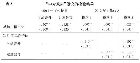 其次,如果城乡户籍出身的高学历劳动者之间确实存在累积性的不平等,那么其具体过程机制又是什么?研究发现,城镇户籍出身者在初期工作上欠缺晋升机会和发生过度教育的可能性都比农村户籍出身者更低,而这种初期工作特征的差异又(部分)解释了他们在后期工作收入和就业质量上的差异。这表明,城镇户籍出身所带来的相对优势,不仅在数量程度上具有“扩大效应”,还在过程机制上具有“中介效应”。