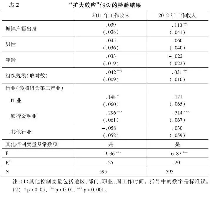 首先,同样作为高学历劳动者,城镇户籍出身与农村户籍出身相比,在工作收入或就业质量上是否具有相对优势,并且这种优势是否随时间而扩大?以往的户籍分层研究大多关注的是(当前)户籍身份而非(原有)户籍出身对劳动者的影响,只能模糊地预测城镇户籍出身者可能具有相对优势。但少量针对大学生的研究确实发现,城乡背景会直接或间接影响到他们的初次就业结果(肖富群,2014)。进一步,从上文介绍的累积优势理论出发,还会预期这种就业差异随时间而扩大,不妨称之为“扩大效应”。这是因为,虽然研究者们在扩展和应用累积优势理论的过程中提出了多样化的具体形式,连“严格意义上的vs.布劳—邓肯式的”这对基本区分也不再足以涵盖,但不平等随时间而增长始终是累积优势的一种主要表现(DiPrete & Eirich, 2006)。相应地,上文提到的许多实证研究都将“扩大效应”作为检验累积优势是否存在的主要或先决条件(例如Long & Fox, 1995; Bielby & Bielby 1996)。但是,也有一种观点认为,高学历劳动者是一个经过了层层能力筛选的人群,其同质性程度较高,所以可能已经摆脱了家庭出身的影响(Breen & Jonsson, 2007; Torche, 2011)。国内对大学生就业的一些研究也发现,家庭背景对应届生的就业机会没有影响(岳昌君、丁小浩,2004;李春玲,2012),父代的社会经济地位对大学毕业生的地位获得没有直接影响(王卫东,2013)。按照这种观点,则会预期城乡出身的高学历劳动者之间不存在显著的就业差异。因此,本文提出关于“扩大效应”的两个竞争假设: