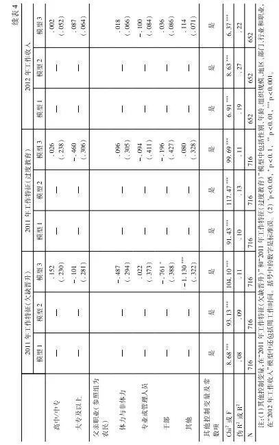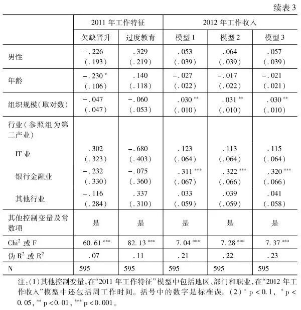 类似地,右栏模型2将过度教育引入对2012年月工作收入的OLS回归模型后发现,它除了本身具有负向净影响以外(p<0.001),还部分解释了城镇户籍出身组相对于农村户籍出身组的收入优势(系数从0.110降至0.095,z值为-2.14)。当右栏模型3将2011年的这两个工作特征同时引入对2012年月工作收入的OLS回归模型后发现,欠缺晋升和过度教育本身仍然具有负向净影响,城镇户籍出身的影响系数进一步降低。总之,右栏模型1至模型3的结果一致表明,城乡户籍出身组之间在2011年工作特征上的差异部分地解释了他们在2012年月工作收入上的差异。至于这种差异的具体表现,正如左栏两个模型所显示的,就是城镇户籍出身者欠缺晋升机会和发生过度教育的可能性都更低。因此,关于“中介效应”的假设2a和假设2b同时得到支持。