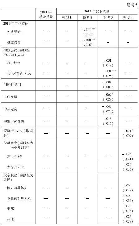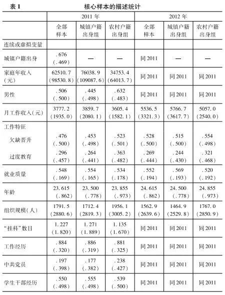 核心样本在主要变量上的描述统计见表1,其中城乡户籍出身者分别占67.6%和32.4%。从家庭背景来看,城镇户籍出身组明显好于农村户籍出身组。例如,前者的家庭年收入高出19%,父母教育程度为大专及以上的比例高出45.57个百分点,父亲职业为专业管理人员或干部的比例高出32.25个百分点。从学校层次来看,.93% vs.10.36%),但毕业于211大学的比例相反却更低(32.09% vs.39.38%),因此他们进入“好大学”的机会差异并不明确。从在校期间的学业成绩、工作经历、,两组之间只在入党变量上存在明显差异,表现为农村户籍出身组的入党比例较高(23.8% vs.17.7%)。从工作特征来看,欠缺晋升机会和发生过度教育这两种情况都较多地见于农村户籍出身组。2011年时,城镇户籍出身组欠缺晋升机会的比例为45.3%,而农村户籍出身组的相应数字为52.3%;城镇户籍出身组发生过度教育的比例为26.4%,而农村户籍出身组的相应数字为36.3%。2012年时,城镇户籍出身组欠缺晋升机会的比例仍然比农村户籍出身组低3.9个百分点,他们发生过度教育的比例也仍然低7.7个百分点。最后,就本研究关注的两个主要因变量来看,城镇户籍出身组具有相对优势,并且这种优势在随时间而扩大。2011年时,与农村户籍出身组相比,城镇户籍出身组的月工作收入高出254元,就业质量得分高出0.02分。到2012年时,这两个数字分别上升至710元和0.05分。