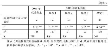 在以工作收入为主要因变量来检验“扩大效应”和“中介效应”研究假设时,笔者采用了最严格的样本限定,只分析那些在两期数据中都出现、两期就业身份都是雇员,并且在模型将要用到的所有变量上都没有缺失值的个案,一共有595人(以下称为核心样本)。这是为了保证本文所检验的累积性不平等或累积优势确实是对同一样本而言,而不会受到两期样本可能在人员构成上有所不同的影响。但在检验“来源效应”研究假设时,笔者放松了样本必须在两期数据都出现的严格要求。在以就业质量为主要因变量来重复检验上述三组研究假设时,也放松了样本必须在两期数据都出现的严格要求。放松样本限定,一方面是为了尽量减少样本损耗,另一方面也是为了检验结果的稳健性。