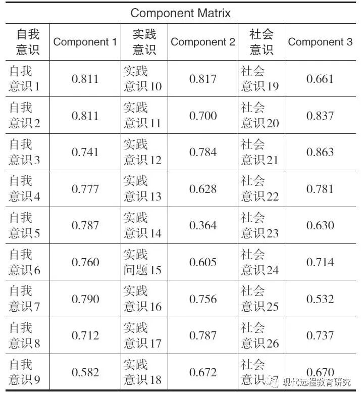 为了检验调查问卷的有效性,分别测量了问卷的效度(结构效度)和信度(一致性)。通过对北京师范大学2015学年度大一新生的“信息技术公共课”的数据采集,先后共发放问卷167份,经探索性因素分析,主成分分析中特征值大于1的共有三项。利用方差最大旋转“Varimax”法得到的各个变量对其主成分(维度)的载荷如表2。