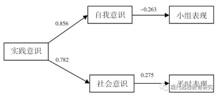 路径分析表明:实践意识对小组表现和平时表现的影响都是间接的,对小组表现的影响要通过自我意识,对平时表现的影响要通过社会意识。而对小组表现有显著直接影响的是自我意识,但贡献率是-0.263,表明是负的贡献,也就是自我意识强的学习者其小组表现反而不积极;对平时表现有显著直接影响的是社会意识,贡献率是0.275。