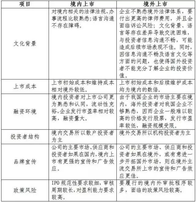 企业选择在境内或者境外上市,应视各自具体情况而定。一般来说,企业在境内或者境外上市主要存在如下差异: