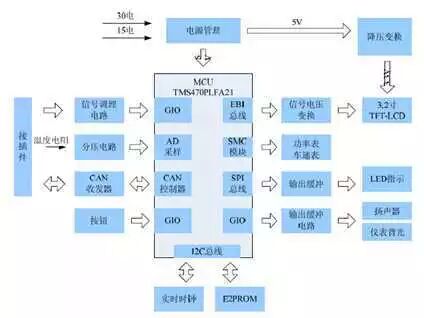 仪表系统通过CAN总线与VCU相连,从VCU获取需要显示的数据。数据传输进仪表控制器以后,信号处理电路,将信息还原成各个仪表的显示内容。