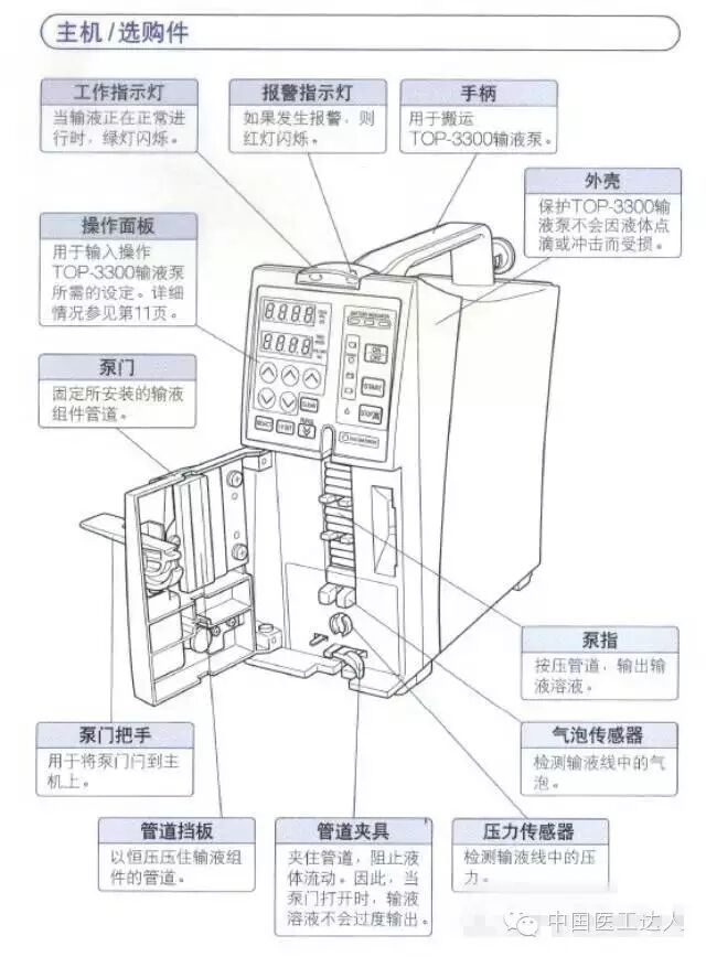 输液泵的驱动原理有蠕动、旋转挤压、双活塞挤压等多种方式,根据各厂家生产品牌的不同而异。通常的输液速度在1-999ml/h。多数输液泵需使用与其相配的专用管道,以保证其流量的精确和均匀。此外,输液泵还具有报警系统,提供安全保证,包括断电、泵门未关、走空、管路阻塞和管路中出现气泡等方面的报警功能。