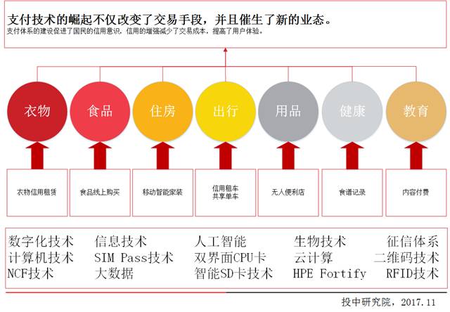 在支付技术的推动下,支付方式发生着巨大的变化。从最初的现金支付,到银行卡支付,再到互联网支撑的数字支付,最后到4G/5G网络支撑的移动支付。支付技术的升级不仅体现在消费者与商家的结算方面,还促成了无人零售模式的创新、各种出行服务的产生以及金融产品的创新等,甚至成为知识付费与供应链效率提升的重要渠道与手段。