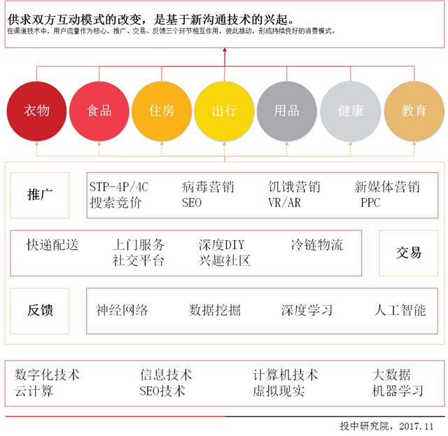 投中研究院将渠道技术划分为推广、交易与反馈三个方面。如同技术驱动三要素间的互动,推广、交易与反馈分别作用于消费者“对话”的不同阶段,形成闭环。