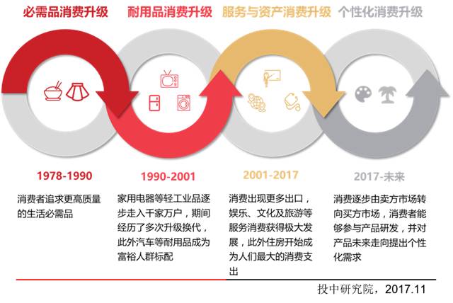 从改革开放之后的消费发展进程来看,国内消费升级主要可以分为四个阶段(下页):