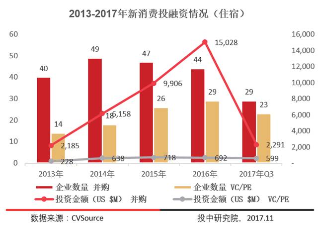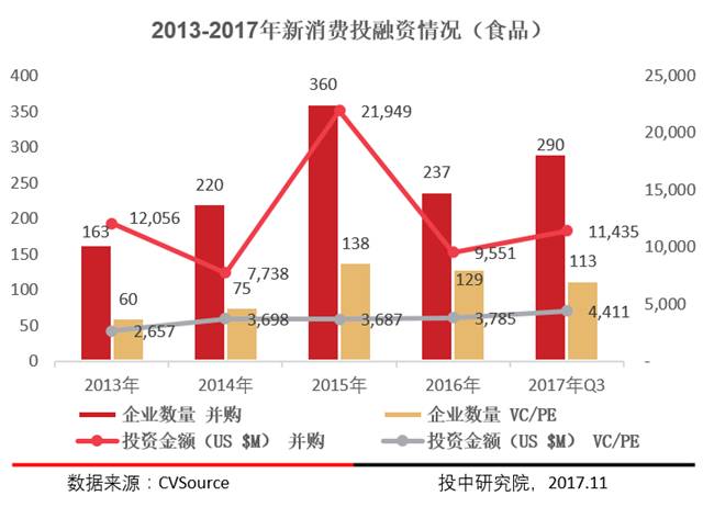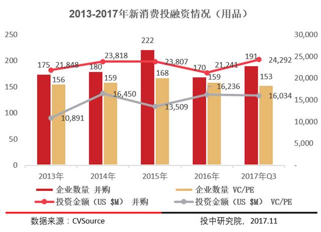 根据投中信息数据终端CVSource数据显示,2013-2017年共有11,168个新消费类项目发生融资,其中并购类项目7,377个,占比为66%;共有6,385.85亿美元资金投入到以上项目中,其中并购类项目涉及金额为4,693.55亿美元,占比为73%。并购类项目无论在项目数量方面还是交易金额方面均占多数。从历年融资金额来看,无论并购类项目还是VC/PE类项目均有大幅提升,其中,并购类项目融资金额增长76%,并一度于2015年达到1460.90亿美元;VC/PE类项目融资金额增长127%。同时,随着新消费类项目不断发展,项目平均融资金额均获得较大提升,并购类项目平均融资金额由2013年的5,796万美元提升至2017年的6,344万美元,VC/PE类项目平均融资金额由2013年的4,328万美元提升至2017年的5,179万美元。此外,相比较于2015年的高峰,2017年前3季度并购融资有所下降,项目平均融资金额也由7,519万美元下降至6,344万美元,新消费类项目迎来高潮后的调整期。