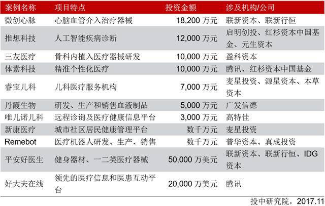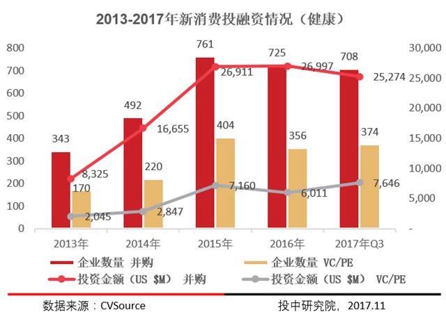 健康方面,根据投中信息数据终端CVSource数据显示,项目融资分布于生物医药、医疗器械与医疗服务领域,并购融资金额在2017年有所下降。面对人口老龄化、环境问题影响及疑难杂症诊疗需求等因素,健康管理项目的投融资仍将受到资本高度关注。同时,由于健康类项目投资周期较长,门槛较高,国内需求将更旺盛,未来并购交易将进入高发期。例如,腾讯、红杉中国共同投资的体素科技利用人工智能进行影像识别将为医生诊断提供有力帮助,提升患者就诊效率。