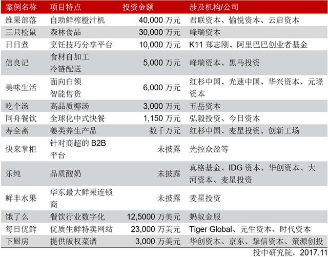 食品方面,根据投中信息数据终端CVSource数据显示,项目融资主要集中在冷链技术及基础设施、高品质食物、新零售场景及餐饮平台等方面。在满足基本食品安全的前提下,消费者进一步提出绿色、有机、新鲜、有品味的餐饮要求。食物消费已经不仅仅是满足消费者生存需求的手段,而开始变为提升生活品质的途径。例如Tiger Global等机构投资的每日优鲜以“城市分选中心+社区配送中心”的极速达冷链物流体系,为消费者提供新鲜质优的食材;由红杉中国领投的美味生活同样主打鲜食供应,解决白领人群的健康需求。