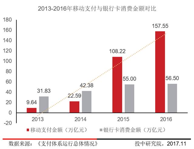 图 13 2013-2016移动支付与银行卡消费金额对比