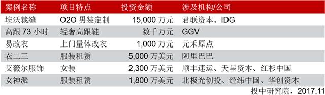 衣物方面,无论是否有很强购买能力的新消费参与者都对衣物提出更高的要求。根据投中信息数据终端CVSource数据显示,衣物类投资主要集中在衣物定制、新品牌打造、传统品牌收购以及衣物共享等方面。消费者不仅要求衣物时尚、个性、紧跟潮流,还需要穿着舒适,搭配适当。正因如此,衣物类项目的投融资始终保持在较高位置,尤其作为一个成熟行业,各路时尚集团均通过发展子品牌的方式进行业务拓展,并购类项目融资数量与金额均高于VC/PE类项目。例如,GGV投资的高跟73小时属于互联网轻奢品牌,由于定位精准,其对独立、有一定经济基础、对生活品质有追求且不迷恋大牌的女性群体具有较强吸引力;而君联资本与IDG投资的埃沃裁缝则是将西服定制推向普通大众的品牌,其以门店测量、工厂生产并结合线上销售的方式获得用户青睐。