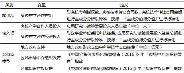本文选取地方政府支持、区域市场中介组织发育水平和知识产权保护水平作为非效率影响变量。当地政府的支持力度,参考原长弘等,选取地方政府财政支出中科学技术支出经费作为地方政府支持的代理变量。地方政府为科学事业支出的费用对于建立健全产学合作基础设施和形成产学合作的良好环境起到重要作用,且该指标不同于政府直接拨给各个高校的经费。市场中介组织的发育,借鉴曹琪格等的做法,选取《中国分省份市场化指数报告(2016)》中“市场中介组织的发育”这一分项指数作为区域市场中介组织发育程度的代理变量。该分项指数由律师、会计师等市场中介组织服务条件和行业协会对企业的帮助程度2个二级分项指数构成,能合理地反映当地为产学合作提供财务、法律和技术等各种服务的中介组织的发育状况。知识产权保护,借鉴邹彩芬等(2014)的做法,选取《中国分省份市场化指数报告(2016)》中“知识产权保护”这一分项指数作为区域知识产权保护水平的代理变量。本文投入、产出和非效率模型变量定义见表1。