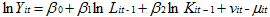效率评价的经典方法主要包括两种,即以数据包括分析(DEA)为代表的非参数方法和以随机前沿分析(SFA)为代表的参数方法。相较于非参数DEA方法,SFA方法有3个优势:它具有统计特性,既可以对模型中的参数进行检验,还可以对模型本身进行检验;它将误差项分解为随机部分和无效率部分,能更准确地测度实际的技术效率水平;不仅可以测算个体的技术效率值,还可以统计验证外生因素对个体效率差异的影响。考虑到SFA方法的优势恰好有助于解决本文的研究问题,本文采用SFA方法来进行分析。柯布-道格拉斯(Cobb-Douglas)和超越对数(Trans-Log)形式是SFA模型常用的两种生产函数形式,相较而言,前者形式简单,应用广泛,对一般的生产效率问题具有较好的估计。因此,本文选用Cobb-Douglas生产函数的随机前沿模型。本文的SFA模型具体如下: