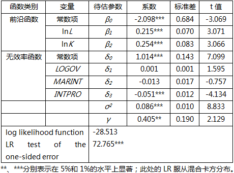 本文通过两个参数来判定模型设定合理与否,其一是检验式(3)中方差参数γ的大小及其显著性。根据Battese和Coelli的研究,γ介于0与1之间,若γ接近于0,表明实际产出与理论最大产出之间的距离来自于不可控的随机因素,这时采用OLS方法进行参数估计即可,无需使用SFA技术;若γ接近于1,表明产出差距主要来源于技术非效率,因而随机前沿模型设定合理。其二是检验广义似然比(LR)统计量,其公式为LR=-2ln