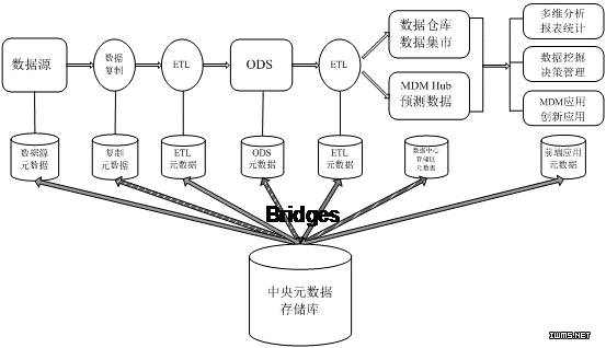 metadata repository)取代各个工具软件和应用程序之间的点对点连接方式,,可以有效降低总成本,减少建立点对点元数据桥的工作,提高投资回报率。信息供应链各组件可以从存储库访问元数据,不必与其他产品进行点对点交互。 meta data architecture),具体如图 5 所示。由于特定的元数据存储库是围绕其自身的元模型、接口和交付服务建立的,所以仍需要建立元数据桥实现与 ISC 各组件的互相访问。