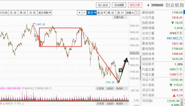 创业板指数1744点以来的一分钟趋势背驰引发了回调,且这个一分钟反弹没有回到上方五分钟中枢内,也就是没有回到1855点上方形成三卖,短期内需要规避。