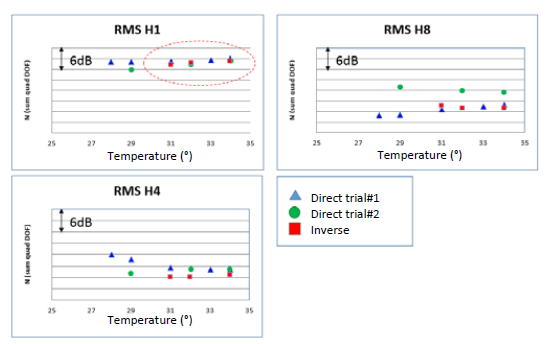 此外,测试结果也显示温度对测试结果有一定影响,尤其是在1倍谐波上。随着温度的提高,连接点上的力会增大。