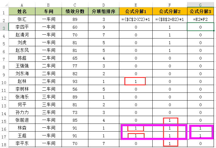 将比较的结果拆解开,见下图中的“公式分解1”这一列