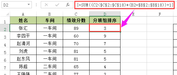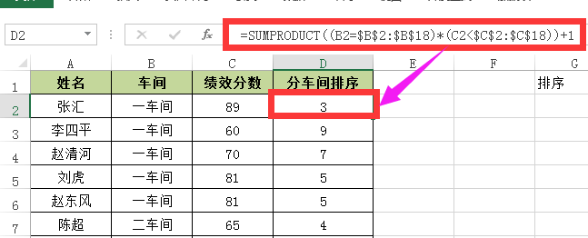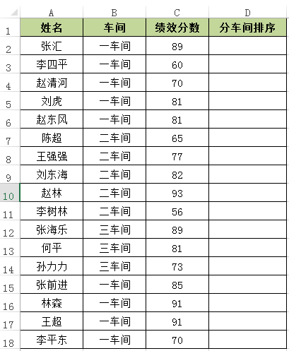 问题:在下面的考核数据表中,需要分不同车间,对员工的绩效考核得分,进行排名。