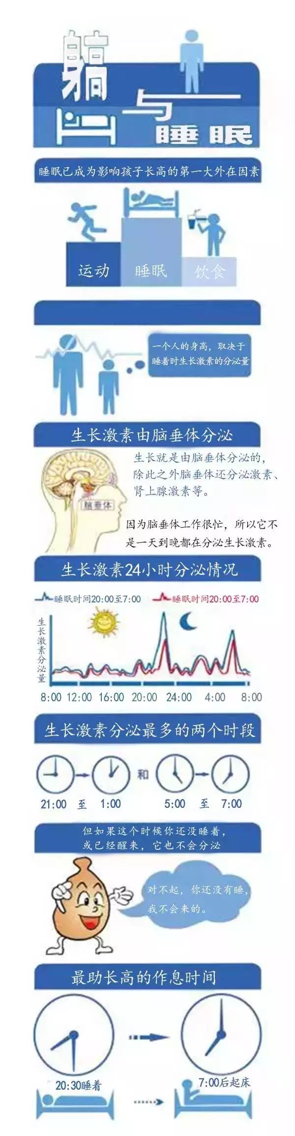 所以生长发育专家的建议是:要孩子长得高,最好在晚上8:30前就上床,最迟不要超过晚9:30,并在早上7点以后再起床。