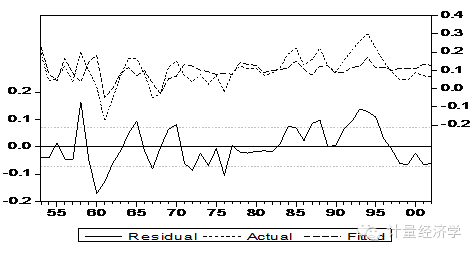 图3为GDP增长率对教育投资增长率的广义差分回归的残差趋势图。图3显示,经广义差分变换,回归模型不仅消除了残差项的序列自相关问题,而且模型对历史数据的拟合效果也非常理想。
