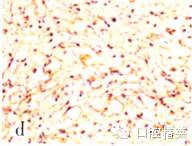临床初步诊断为口腔巨大血管淋巴管瘤,患儿于2013-09-25全麻状态下完整取下肿瘤送病理检查,病理大体可见:灰红、灰白已剖开包块1个,大小为4.0 cm×3.0 cm×2.5 cm,切面呈灰白、灰红,质韧。镜检(图b、c):肿瘤表面局部被覆复层鳞状上皮,瘤细胞呈巢团状或条索状排列,瘤细胞为多边形,胞浆丰富,富含嗜酸性颗粒,细胞核小、圆,无明显异型性,肿瘤表面局部有多量中性粒细胞为主的炎细胞浸润。免疫组织化学检测结果(图d):NSE(++)、Vim(+)、S100(-)、GFAP(-)、CEA(-)、Pan-CK(-)、CD68(-)、NF(-)、Desmin(-)。