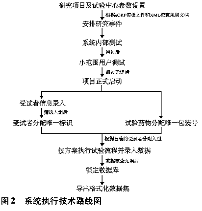 eClinicaXY数据采集平台临床试验执行技术路线可分为如下儿步:(1)项目设置,项目管理员根据具体临床试验方案设定研究项目详细信息、受试者入组条件及分组、项目参数等,数据 管理员根据方案CRF和数据管理计划编写eCRF源文件和XML数据核查文档,并以同名配对的方式导人系统。项目管理员将生成的研究事件组合为试验执行流程,在系统内技术测试和小范围可接受测试通过后将研究项目状态设置为“有效”;(2)受试者入组,各中心将受试者信息输人系统,待筛选完成后系统按照预先设定的试验类型和随机化方法为受试者自动分配唯一标识(SUBJID),通过“受试者唯一标识-无序随机号-治疗方案-尤序药物包装号”盲态联动的药号分离方式确保试验盲态的顺利实施;(3)试验数据录入,研究者或CRC根据每位受试者的试验进程将产生的研究数据以隔离双份录人的形式录人对应数据条目,若首次录入出现逻辑错误或二次录入与首次录人不一致时会触发预设核查条件并在数据保存之前提醒操作者,循环直至所有数据核查无误。若有疑问可随时通过交互应答系统向研究者发出质疑;(4)数据导出,待最后一例受试者完成试验且尤遗留质疑时数据管理员可根据数据库锁定清单锁定数据库并依照试验方案以CDISCODM 格式导出受试者数据,之后由统计程序员将其分割、重组为统计分析数据集和递交数据集。整体执行技术路线见图2。
