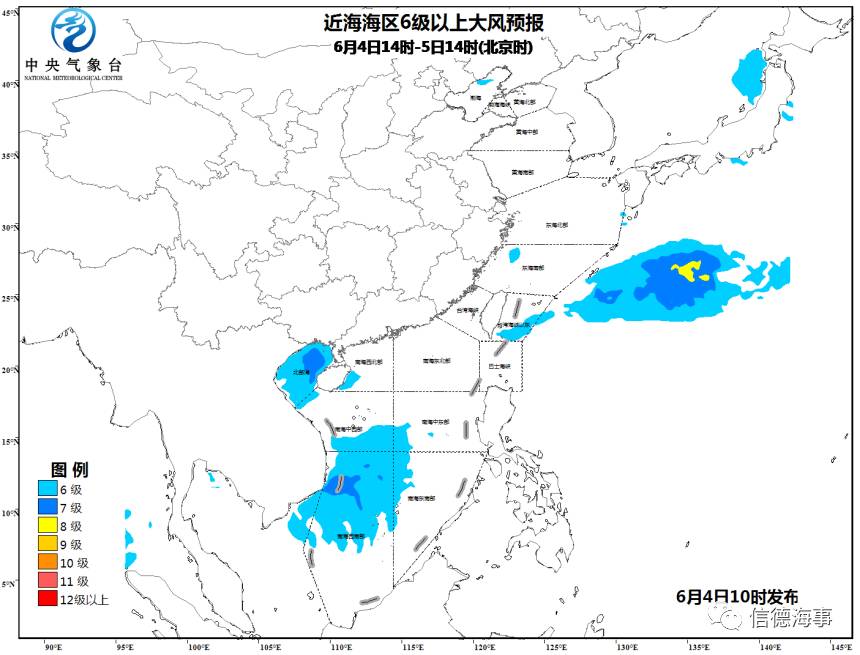 预计,5日夜间至7日上午,受入海气旋影响,黄海大部海域、东海北部海域将有7~8级、阵风9~10级大风。为此,中央气象台6月4日10时发布海上大风预报。受大风影响海域航行、作业的船舶,需注意航行安全。