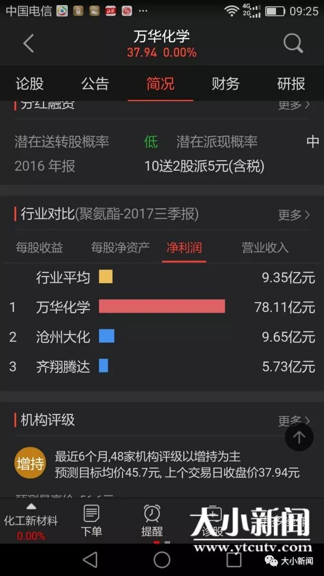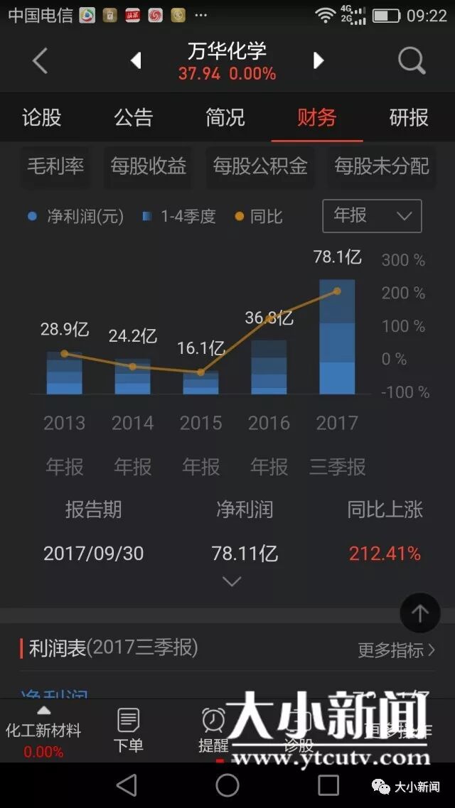 2017年万华化学三季报净利润78.11亿元