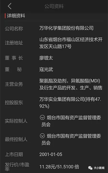 大小新闻获悉,万华化学的母公司万华实业集团有限公司是一家高科技化工企业,作为国内唯一一家同时拥有MDI、TDI、ADI全系列异氰酸酯制造技术自主知识产权的企业,其MDI(二苯基甲烷二异氰酸酯)产量居全球第一。MDI是生产聚氨酯最重要的原料,该材料既有橡胶的弹性,又有塑料的强度和优异的加工性能,尤其是在隔热、隔音、耐磨、耐油、弹性等方面有其它合成材料无法比拟的优点,已广泛应用于国防、航天、汽车、医疗等领域,成为经济发展和人民生活不可缺少的新兴材料。