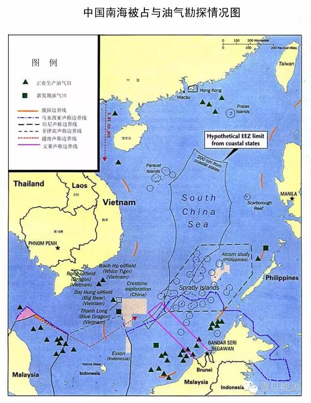 马来西亚出口石油70%来自南沙海域。1982年,,周边各国为获得200海里专属经济区,对南沙岛屿的争夺更趋白热化。1983年—1999年,,实际占领了其中至少6个,并在岛上派军,修建永久建筑。资料显示,马来西亚出口石油的70%来自南沙海域。(如图所示曾母盆地上遍布马来和文莱的油气井群和海底石油气管道。)