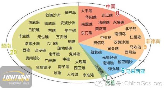 争端。起源于(上世纪)60年代末、70年代初中国近海油气资源的发现。1968年,,周边各国随之群起瓜分南沙岛礁。据1998年的统计资料显示,周边的东南亚国家已在南沙海域钻探了1000多口油气井,找到了97个油田和含油构造,95个气田和含气构造,其中位于中国断续疆域线以内的油田有28个、气井225个;石油总产量每天达200多万桶,主要开采国家为马来西亚、越南、印尼、文莱和泰国。 (图为中国岛礁被周边国家侵占示意图:来源铁血网)