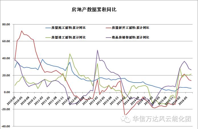 当下,房地产市场复苏态势正在延续。今年以来,房地产行业领跑全国GDP增长,销售与价格大幅攀升,部分一二线城市涨幅较大,全国个人住房贷款在新增贷款中占了绝大部分;从全国房屋新开工面积、竣工面积、销售面积来看,2016年1-7月份,房地产市场的数据较去年同期均有大幅度好转。2016年7月,房屋新开工面积累积同比增长13.7%,房屋施工面积累积同比增长4.8%,竣工面积累积同比增长21.3%,销售面积累积同比增长26.4.从图上也可以看出,在2016年一季度开始,房地产各项数据均出现大幅度的回升,给予经济企稳较大的贡献。