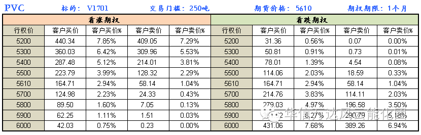 图为2016年9月9日华信万达期货PVC场外期权的报价图。根据报价来看,上游企业可以选择行权价为5200-6000区间的看跌期权。例如:目前期货1月合约价格为5610,上游企业可以选择买入行权价为5610的看跌期权,所需要支付的权利金为164.71元。即意味着到了10月10日,若期货1月合约价格跌至5000,企业可以以5610的价格卖出1月合约,即获得5610-5000区间的盈利。若价格上涨至5900,则企业可以放弃行权,选择以5900的价格在期货市场或者现货市场卖出货物。而企业的损失只是164.71元的权利金,同时无论期货价格出现大幅上涨或者下跌,企业均不需要再追加保证金,相当于用确定的资金做了一个月期的保障,不仅规避了价格下跌的风险,同时也降低了企业参与期货市场的资金成本。