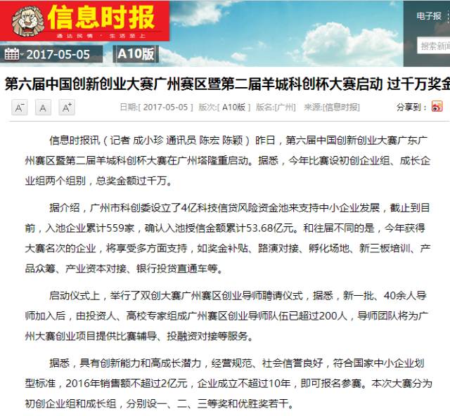 5月4日,第六届中国创新创业大赛(广东·广州赛区)暨第二届羊城“科创杯”创新创业大赛小蛮腰启动仪式成功举办。广州市女科技工作者协会创会会长苏晋中、广州市科技创新委员会弓鸿午书记、科技金融处欧阳滨处长、科普宣传处袁耀飞处长、广州国发控股公司高东旺总经理、万联证券王耀南党委书记、广州市人力资源和社会保障局冯星树副巡视员、广州市工业信息化委员会中小企业局黄星耀副局长、中国银行广东省分行中小企业部潘瑞宏总经理、广东省生产力侯穗副书记、广州市金融局罗永忠处长、市委宣传部周振伟处长、广州科技开发总公司李运南总经理、广州市科技金融综合服务中心吴俭峰董事长、秦海鸥总经理、广州市青年就业创业服务中心陈建霖主任、天河科工信局宋爱平局长、、从化科工信局董小星副局长、南沙科信局刘成处长、万燕传媒常娜常务副总裁、邓大安副总裁等领导出席了活动。主承协办、支持单位、特别支持单位及超过200家企业及机构,30余家媒体到场参与支持。