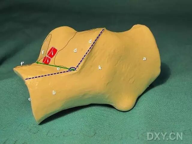 图3 跟骨外侧面观。a: 跟骨结节;b: 前凸;c: 跟骰关节;d: 距下关节后部;e: 跗骨窦;f: 跟骨-距骨颈关节的中间面;f’: 跟骨-距骨颈关节前关节面;i: 骨间韧带;k: 外侧皮质。