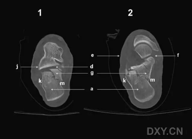 图2 跟骨内侧面观。a: 跟骨结节;b: 前凸;d: 距下关节后部;f: 跟骨-距骨颈关节的中间关节面;g: 载距突;h: 拇长屈肌腱沟;m: 内侧皮质。
